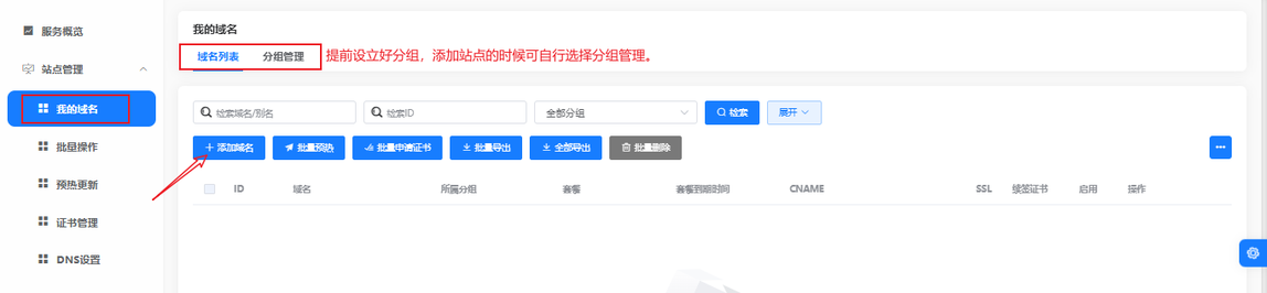 {日志服务} 查看登录日志/操作日志/套餐日志/财务日志1{站点管理} 创建站点、证书管理、清理缓存及一些批量操作功能。